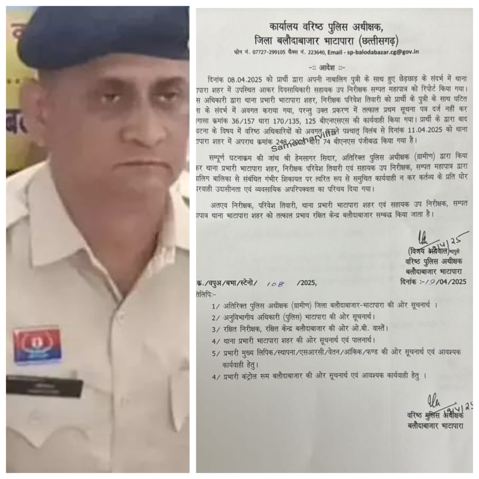 рдЗрд╕рд╕реЗ рдкрд╣рд▓реЗ рдПрд╕рдПрд╕рдкреА рдХреЗ рдЖрджреЗрд╢ рдкрд░ рднрд╛рдЯрд╛рдкрд╛рд░рд╛ рдерд╛рдиреЗ рдореЗрдВ 11 рдЕрдкреНрд░реИрд▓ рдХреЛ рдзрд╛рд░рд╛ 74 рдмреАрдПрд╕рдПрди рдХрд╛ рдЕрдкрд░рд╛рдз рджрд░реНрдЬ рдХрд┐рдпрд╛ рдЧрдпрд╛ред рдЗрдзрд░ рдирд╛рдмрд╛рд▓рд┐рдЧ рдХреЗ рдорд╛рдорд▓реЗ рдореЗрдВ рдШреЛрд░ рд▓рд╛рдкрд░рд╡рд╛рд╣реА рдмрд░рддрдиреЗ рдХреЗ рдЖрд░реЛрдк рд╕реЗ рдирд╛рд░рд╛рдЬ рдПрд╕рдПрд╕рдкреА рдиреЗ рдЯреАрдЖрдИ рдкрд░рд┐рд╡реЗрд╢ рддрд┐рд╡рд╛рд░реА рдФрд░ рдПрд╕рдЖрдИ рдорд╣рд╛рдкрд╛рддреНрд░ рдХреЛ рд▓рд╛рдЗрди рдЕрдЯреИрдЪ рдХрд░ рджрд┐рдпрд╛ рд╣реИред